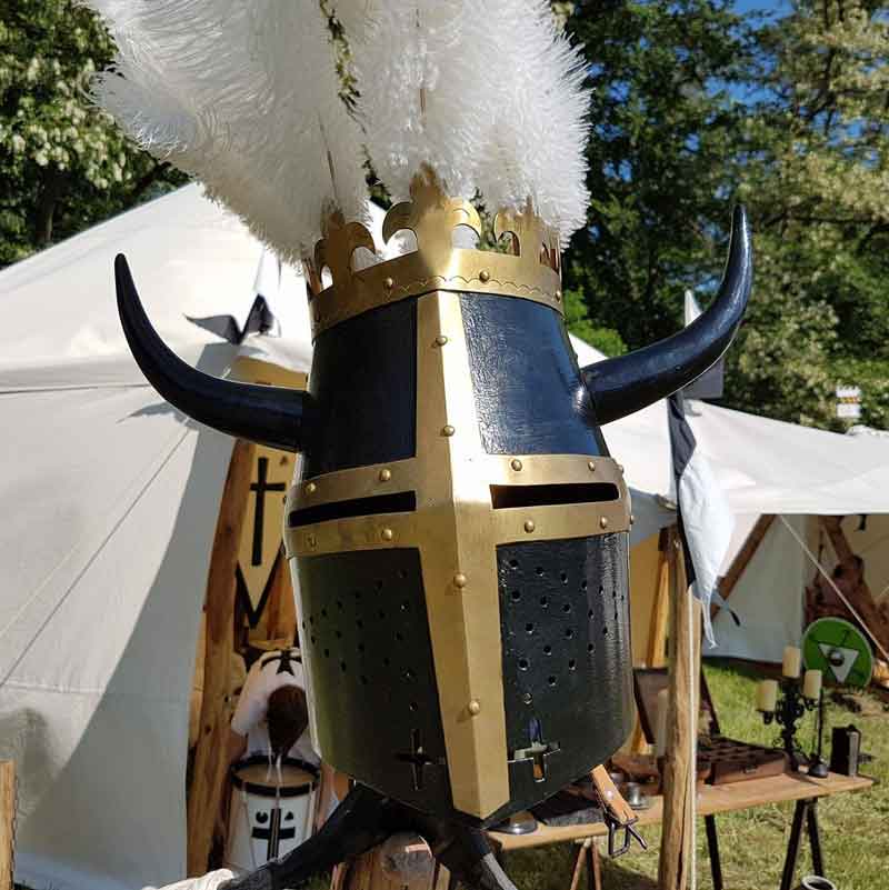 Ons kampement is in de stijl van de kruistochten in de 12e eeuw. De typische witte mantels met de zwarte kruizen zijn altijd een opvallende verschijning, zelfs tussen andere ridders. We vertellen graag over het middeleeuwse bestaan van ridders en hun geschiedenis.